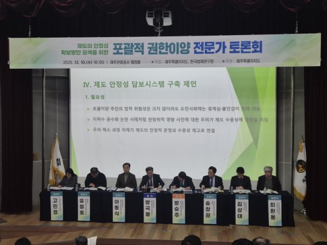 Á¦ÁÖµµ´Â 10ÀÏ ¿ÀÈÄ 4½Ã Á¦ÁÖ°ü±¤°ø»ç À£ÄÄȦ¿¡¼ Çѱ¹¹ýÁ¦¿¬±¸¿ø°ú °øµ¿À¸·Î ¡®Æ÷°ýÀû ±ÇÇÑÀÌ¾ç ¾ÈÁ¤¼º È®º¸ ¹æ¾È ¸¶·ÃÀ» À§ÇÑ Àü¹®°¡ Åä·Ðȸ¡¯¸¦ °³ÃÖÇß´Ù. À̹ø Åä·Ðȸ¿¡´Â Çаè¿Í °ü°è±â°ü, µµ¹Î µî 100¿© ¸íÀÌ Âü¼®ÇØ Æ÷°ýÀû ±ÇÇÑÀÌ¾ç µµÀÔ¿¡ µû¸¥ ¾ÈÁ¤¼º ´ãº¸ ÀåÄ¡¸¦ ¾î¶»°Ô Á¦µµÈÇÒ °ÍÀÎÁö ³íÀÇÇß´Ù.