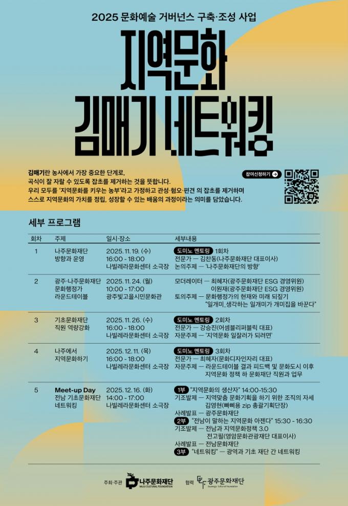 ³ªÁÖ¹®È­Àç´Ü(ÀÌ»çÀå À±º´ÅÂ)Àº ¿À´Â 12¿ù 16ÀÏ ³ªºô·¹¶ó¹®È­¼¾ÅÍ ¼Ò±ØÀå¿¡¼­ ¡®Meet-up Day(¹Ô¾÷µ¥ÀÌ)¡¯¸¦ ¿­°í Àü³²¡¤±¤ÁÖ±Ç ±¤¿ª¡¤±âÃʹ®È­Àç´Ü°ú ÇÔ²² Áö¿ª¹®È­ Çù·Âü°è¸¦ ±¸ÃàÇÑ´Ù°í 11ÀÏ ¹àÇû´Ù.