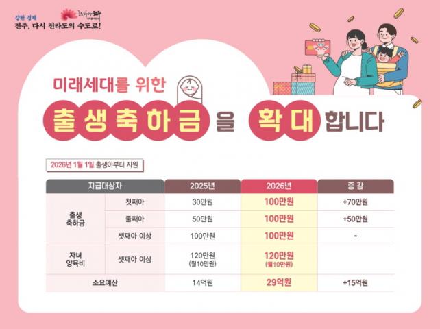 ÇÑÆí, Ãâ»ýÃàÇϱÝÀº 2026³â 1¿ù 1ÀÏ ÀÌÈÄ Ãâ»ý¾ÆºÎÅÍ Àû¿ëµÇ¸ç, Áö¿ø ´ë»óÀº ÀüÁֽÿ¡ Ãâ»ý ½Å°íÇÑ Ãâ»ý¾Æ·Î, Ãâ»ýÀÏ ÇöÀç Ãâ»ý¾ÆÀÇ ºÎ ¶Ç´Â ¸ð°¡ ÀüÁֽÿ¡ Áֹεî·ÏÀÌ µÅ ÀÖ°í, Áö¿ø ´ë»óÀÚÀÎ Ãâ»ý¾Æ°¡ Áֹεî·Ï»ó µ¿ÀÏ ¼¼´ë¿øÀ̾î¾ß ÇÑ´Ù. Ãâ»ýÃàÇÏ±Ý ½ÅûÀº ÁÖ¼ÒÁö °üÇÒ Áֹμ¾ÅÍ¿¡¼ Ãâ»ý½Å°í¿Í µ¿½Ã¿¡ °¡´ÉÇÏ´Ù.