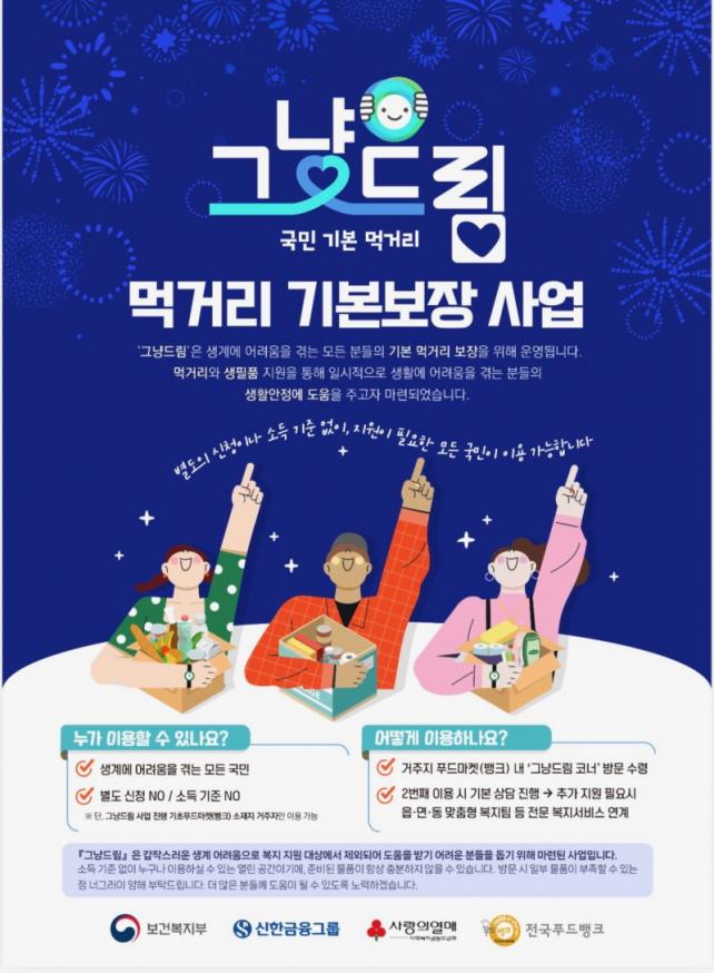 15ÀÏ ÀÍ»ê½Ã¿¡ µû¸£¸é Á¤ºÎ°¡ »õ·Î µµÀÔÇÏ´Â '±×³Éµå¸²' »ç¾÷Àº °©ÀÛ½º·¯¿î »ý°è À§±â³ª Áúº´, ½ÇÁ÷ µîÀ¸·Î ½Ä·áǰ Áö¿øÀÌ ÇÊ¿äÇÑ ½Ã¹Î¿¡°Ô Áï½Ã ½Ä·áǰÀ» Á¦°øÇÏ´Â ±¹°¡ Â÷¿øÀÇ º¹Áö º¸Àå Á¤Ã¥ÀÌ´Ù. Áö¿ø ÀýÂ÷¸¦ °£¼ÒÈÇØ Á¢±Ù¼ºÀ» ³ôÀÎ °ÍÀÌ Æ¯Â¡ÀÌ´Ù.