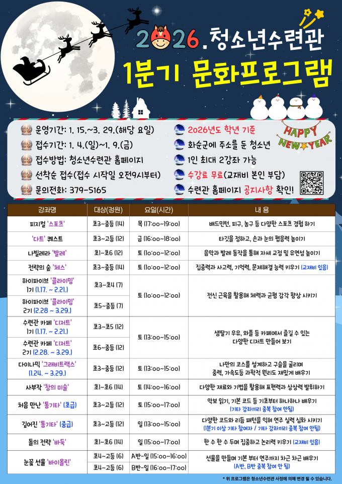 ÇÑÆí, 1¿ù 4ÀϺÎÅÍ 1¿ù 9ÀϱîÁö ȼø±ºÃ»¼Ò³â¼ö·Ã°ü ´©¸®Áý(https://hwasunyouth.kr/)¡®ÇÁ·Î±×·¥ ½Åû °Ô½ÃÆÇ¡¯À» ÅëÇØ ¿Â¶óÀÎÀ¸·Î Á¢¼öÇÏ¸é µÈ´Ù. 1ºÐ±â ÇÁ·Î±×·¥Àº 1¿ù 15ÀϺÎÅÍ 3¿ù 29ÀϱîÁö ¿î¿µµÇ¸ç, ȼø±º¿¡ ÁÖ¼Ò¸¦ µÐ û¼Ò³âÀº ´©±¸³ª Âü¿©ÇÒ ¼ö ÀÖ´Ù. ÀÚ¼¼ÇÑ ÀÏÁ¤°ú °Áº° ¼¼ºÎ ³»¿ëÀº ȼø±ºÃ»¼Ò³â¼ö·Ã°ü ´©¸®ÁýÀ» Âü°íÇϰųª ¹®È ÇÁ·Î±×·¥ ´ã´çÀÚ(¢Ï061-379-5165)¿¡°Ô ¹®ÀÇÇÏ¸é µÈ´Ù.