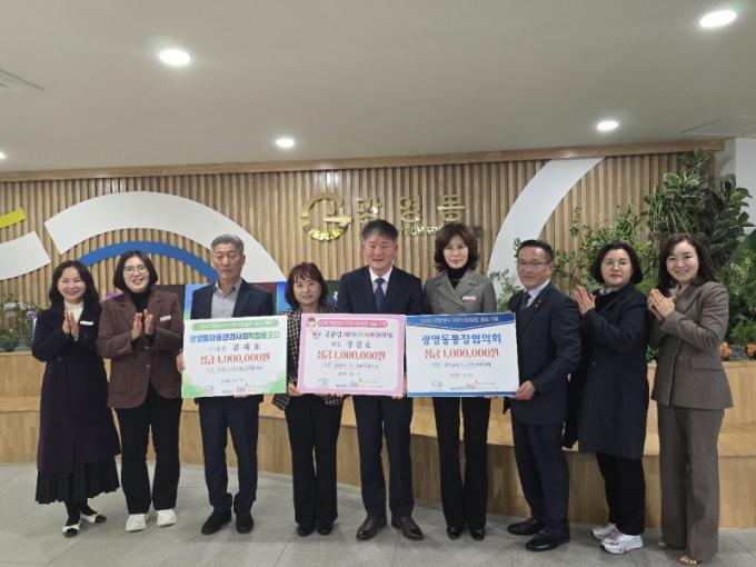 À̳¯ ±âŹ½Ä¿¡¼ ¡ã±¤¿µµ¿ ÅëÀåÇùÀÇȸ(´ÜÀå ¼Á¤¹Î)°¡ 100¸¸ ¿ø ¡ã°±æ¼ø ÇØÇǾÆÀ̾ÀÌÁý ¿øÀåÀÌ 100¸¸ ¿ø ¡ã±èÀçÈ£ ±¤¿µµ¿¸¶À»°ü¸®»çȸÀûÇùµ¿Á¶ÇÕ ÀÌ»çÀåÀÌ 100¸¸ ¿øÀ» Àü´ÞÇßÀ¸¸ç, ÈÄ¿ø±ÝÀº (Àç)±¤¾ç½Ã»ç¶û³ª´®º¹ÁöÀç´ÜÀ» ÅëÇØ ±¤¿µµ¿ Áö¿ª»çȸº¸ÀåÇùÀÇü(°ø°øÀ§¿øÀå Àå¹ÌÇâ, ¹Î°£À§¿øÀå Á¶Ä¥±Ô)¿¡ ÁöÁ¤±âŹµÆ´Ù.