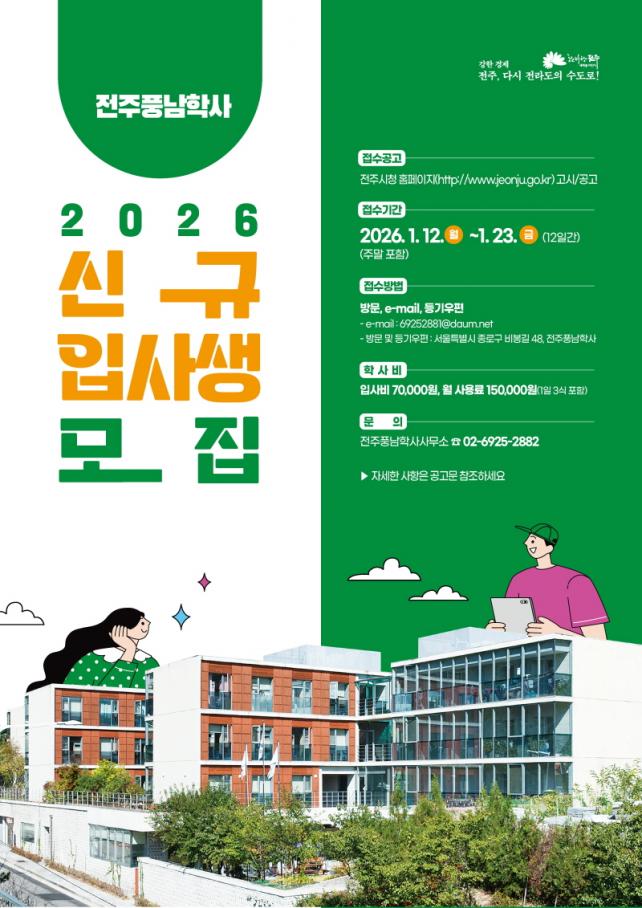 ÀüÁֽô ¿À´Â 12ÀϺÎÅÍ 23ÀϱîÁö ¼öµµ±Ç ¼ÒÀç ´ëÇп¡ ÁøÇÐÇÑ ÀüÁÖ¡¤¿ÏÁÖ Ãâ½Å ´ëÇлýÀ» ´ë»óÀ¸·Î 2026³âµµ ½Å±ÔÀÔ»ç»ý 43¸íÀ» ¸ðÁýÇÒ °èȹÀ̶ó°í 2ÀÏ ¹àÇû´Ù.