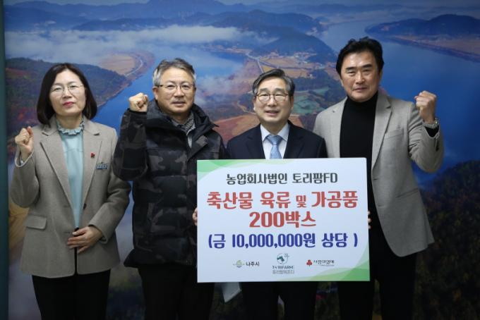 ³ªÁÖ½Ã(½ÃÀå À±º´ÅÂ)´Â Áö³´Þ 30ÀÏ ³ó¾÷ȸ»ç¹ýÀÎ Å丮ÆÊFD(´ëÇ¥ ÃÖ¿øÁØ)°¡ °ü³» Ãë¾à°èÃþ Áö¿øÀ» À§ÇØ »ï°ã»ì, ¸ñ»ì, ¾Õ´Ù¸´»ì µî Ãà»ê¹° °¡°øÇ° 200¹Ú½º(1õ¸¸ ¿ø »ó´ç)¸¦ ±âŹÇß´Ù°í 2ÀÏ ¹àÇû´Ù.