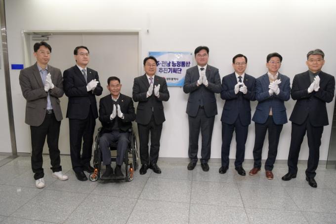 ÇàÁ¤ÅëÇÕ Àü´ã±â±¸ÀÎ ÃßÁø±âȹ´Ü Ãâ¹üÀº Áö³ 2ÀÏ °±âÁ¤ ±¤ÁÖ½ÃÀå°ú ±è¿µ·Ï Àü³²Áö»ç°¡ ¹ßÇ¥ÇÑ ¡®±¤ÁÖ‧Àü³² ÇàÁ¤ÅëÇÕ °øµ¿ ¼±¾ð¡¯ÀÇ ÈÄ¼Ó Á¶Ä¡´Ù. ±¤ÁÖ¡¤Àü³² ´ëÅëÇÕÀÌ ´õ ÀÌ»ó ³íÀÇ ´Ü°è¿¡ ¸Ó¹«¸£Áö ¾Ê°í ½ÇÁúÀûÀÎ Áغñ¿Í ½ÇÇà ±¹¸é¿¡ Á¢¾îµé¾úÀ½À» ¾Ë¸®´Â ½ÅȣźÀÌ´Ù.
