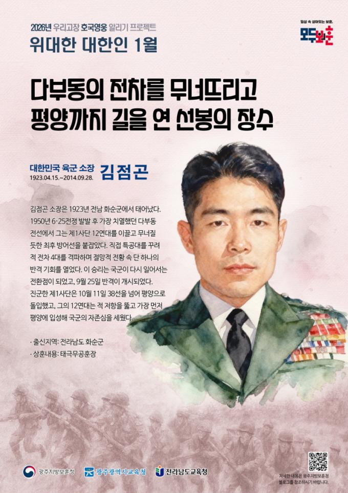 ±¤ÁÖÁö¹æº¸ÈÆÃ»Àº ¡°±èÁ¡°ï À°±º ¼ÒÀåÀÇ »îÀº ¿À´ÃÀÇ ´ëÇѹα¹À» °¡´ÉÇÏ°Ô ÇÑ Çå½ÅÀÇ ¿ª»ç¡±¶ó¸ç ¡°¾ÕÀ¸·Îµµ Áö¿ª°ú ÇÔ²² À§´ëÇÑ ´ëÇÑÀÎÀÇ ¹ßÀÚÃ븦 Áö¼ÓÀûÀ¸·Î ¾Ë¸®°í, ÀÏ»ó ¼Ó¿¡¼ º¸ÈÆÀÇ Àǹ̸¦ °øÀ¯ÇØ ³ª°¡°Ú´Ù¡±°í ¹àÇû´Ù.