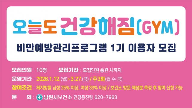 Âü¿©¸¦ Èñ¸ÁÇÏ´Â Áö¿ªÁÖ¹ÎÀº ¿ì¼± º¸°Ç¼Ò ÁֹΰǰÁõÁø¼¾ÅÍ¿¡ ¹æ¹®ÇÏ¿© ü¼ººÐ ÃøÁ¤ ÈÄ Ã¼Áö¹æ·üÀÌ ³²¼º 25%, ¿©¼º 33% ÀÌ»óÀÎ °æ¿ì ´ë»óÀÚ·Î ¼±Á¤µÇ¾î ÇÁ·Î±×·¥¿¡ Âü¿©ÇÒ ¼ö ÀÖ°í. ¡¸¿À´Ãµµ °Ç°ÇØÁü(GYM)¡¹ 1±â ÇÁ·Î±×·¥¿¡ ¼±Á¤µÈ Âü¿©ÀÚ´Â 3°³¿ù µ¿¾È ÁÖ 3ȸ(¿ù¡¤¼ö¡¤±Ý) ¿îµ¿ Áöµµ¿Í, °³ÀÎ ¸ÂÃãÇü ¿µ¾ç »ó´ã ¼ºñ½ºµµ ÇÔ²² Á¦°ø¹ÞÀ» ¼ö ÀÖÀ¸¸ç,
