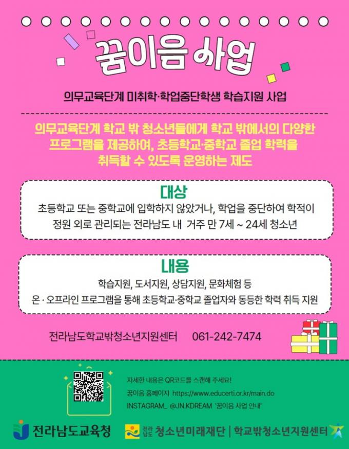 ¡®²ÞÀÌÀ½¡¯ »ç¾÷Àº Àǹ«±³À°´Ü°è Çб³ ¹Û û¼Ò³âÀ» ´ë»óÀ¸·Î ÇнÀÁö¿ø ÇÁ·Î±×·¥°ú ¿Â¶óÀÎ ±³À°°úÁ¤, Çб³ ¹Û ÇнÀ°æÇè µîÀ» Á¦°øÇÏ¿© ÇнÀ Áö¼ÓÀ» µµ¸ðÇÏ´Â µ¥ ¸ñÀûÀÌ ÀÖ´Ù. ¹è¿òÀÇ ±âȸ¸¦ ´Ù½Ã ¿¬°áÇϰí û¼Ò³âÀÇ ²ÞÀ» À̾´Ù´Â Àǹ̸¦ ´ã¾Æ ¡®²ÞÀÌÀ½¡¯À̶ó´Â À̸§À¸·Î ¿î¿µµÇ°í ÀÖ´Ù.