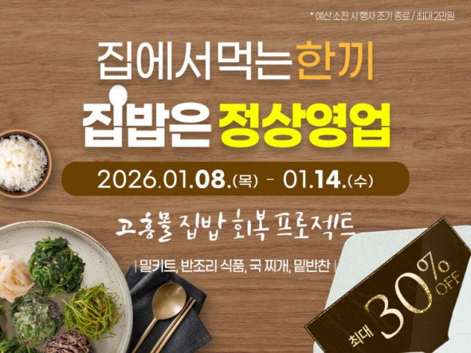 À̹ø Çà»ç´Â ¡®Áý¿¡¼ ¸Ô´Â ÇÑ ³¢, Áý¹äÀº Á¤»ó¿µ¾÷¡¯À» ÁÖÁ¦·Î, ¹ÐŰƮ¡¤¹ÝÁ¶¸® ½Äǰ¡¤±¹¡¤Âî°³·ù¡¤¹Ø¹ÝÂù µî Áý¿¡¼ ¼Õ½±°Ô ÁغñÇÒ ¼ö ÀÖ´Â »óǰÀ» Áß½ÉÀ¸·Î ÃÖ´ë 30% ÇÒÀÎ ÇýÅÃÀ» Á¦°øÇÑ´Ù. Çà»ç ±â°£Àº 1¿ù 8ÀϺÎÅÍ 14ÀϱîÁö´Ù.