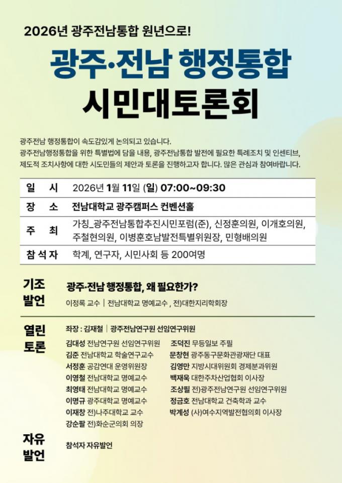 ¹ÎÇü¹è ÀÇ¿øÀº ¡°Áö¹æ ¼Ò¸êÀÇ À§±â ¼Ó¿¡¼ ±¤ÁÖ¿Í Àü³²ÀÇ ÅëÇÕÀº ¼±ÅÃÀÌ ¾Æ´Ñ »ýÁ¸À» À§ÇÑ Çʼö °úÁ¦¡±¶ó¸ç ¡°À̹ø Åä·Ðȸ°¡ 2026³âÀ» ÅëÇÕÀÇ ¿ø³âÀ¸·Î ¸¸µå´Â °áÁ¤ÀûÀÎ ±âÆøÁ¦°¡ µÇ±â¸¦ ±â´ëÇϸç, ±¹È¸ Â÷¿ø¿¡¼µµ Ưº°¹ý Á¦Á¤ µî Á¦µµÀû µÞ¹Þħ¿¡ ¿Â ÈûÀ» ½ñ°Ú´Ù¡±°í ¹àÇû´Ù.
