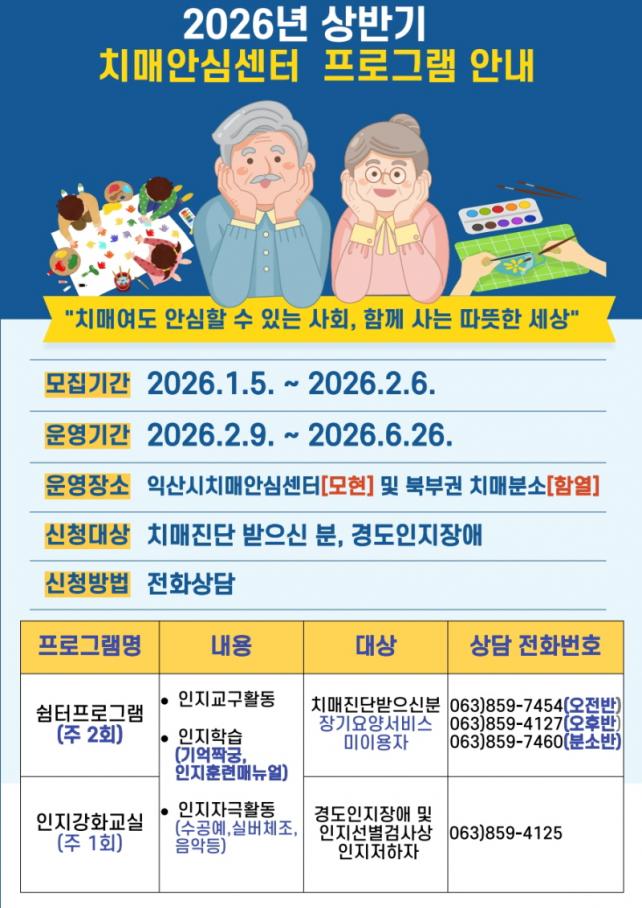 ¸ðÁý ´ë»óÀº ÀÍ»ê½Ã Ä¡¸Å¾È½É¼¾ÅÍ¿¡ µî·ÏµÈ °æµµÀÎÁöÀå¾Ö ¹× °æÁõ Ä¡¸ÅȯÀÚ °¡¿îµ¥ Àå±â¿ä¾ç¼ºñ½º¸¦ ÀÌ¿ëÇÏÁö ¾Ê´Â ½Ã¹ÎÀÌ´Ù. Âü¿©ÀÚ´Â ¼±Âø¼øÀ¸·Î ¸ðÁýÇϸç, Âü¿©¸¦ Èñ¸ÁÇÏ´Â °æ¿ì Ä¡¸Å¾È½É¼¾ÅÍ¿¡ ½ÅûÇÏ¸é µÈ´Ù.