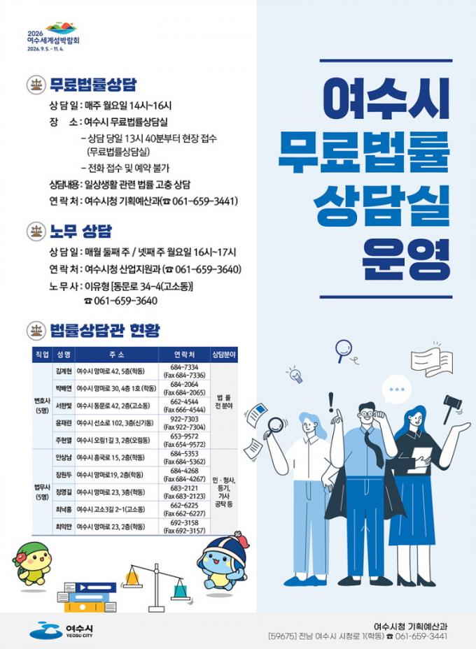 ¹ý·ü Á¢±ÙÀÌ ¾î·Á¿î ½Ã¹ÎµéÀ» À§ÇØ Àü³² ÃÖÃÊ·Î 1999³âºÎÅÍ ¹«·á¹ý·ü»ó´ã½ÇÀ» ¿î¿µÇØ ¿ÔÀ¸¸ç, ¿ÃÇØµµ º¯È£»ç 5¸í°ú ¹ý¹«»ç 5¸íÀ» ¹«·á¹ý·ü»ó´ã°üÀ¸·Î À§ÃËÇÏ°í ½Ç½ÃÇÑ´Ù. ¿©¼ö½Ã´Â Áö³ 2025³â ÇÑ ÇØ ÃÑ 559°ÇÀÇ ¹ý·ü »ó´ãÀ» ½Ç½ÃÇÏ¿´´Ù.