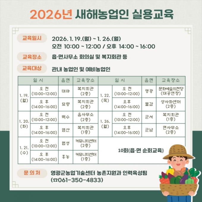 [È£³²µµ¹Î½Å¹® = ÀÓÀ±Áø ±âÀÚ] ¿µ±¤±ºÀº ¿À´Â 1¿ù 19ÀϺÎÅÍ 26ÀϱîÁö °¢ À¾¡¤¸é¿¡¼­ ³ó¾÷ÀÎ 1,800¸íÀ» ´ë»óÀ¸·Î ¡°2026³â »õÇØ ³ó¾÷ÀÎ ½Ç¿ë±³À°¡±À» ½Ç½ÃÇÑ´Ù°í ¹àÇû´Ù.