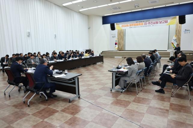 ±è¿Ï±Ù Á¦ÁÖ½ÃÀå ÁÖÀç·Î ÁøÇàµÈ À̹ø º¸°íȸ´Â 2026 Á¦ÁÖµéºÒÃàÁ¦ÀÇ ¼º°øÀûÀÎ °³ÃÖ¸¦ À§ÇÑ ÃàÁ¦ ¼¼ºÎ°èȹ°ú Áغñ»çÇ×À» Á¡°ËÇÏ°í ºÎ¼­ °£ Çù·Âü°è¸¦ °­È­Çϱâ À§ÇØ ¸¶·ÃµÆ´Ù.