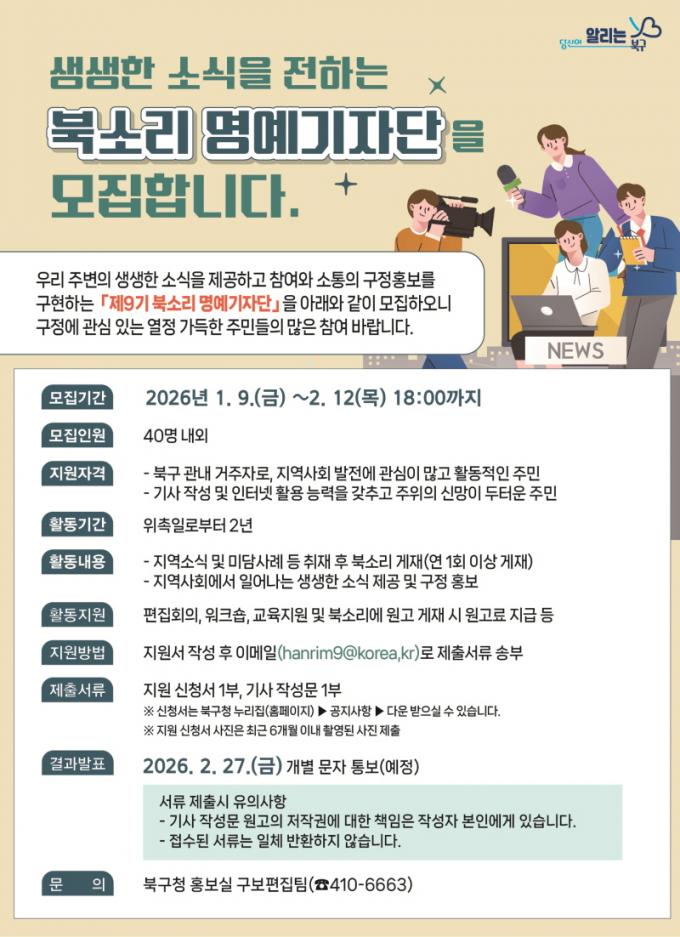 À̹ø ¸ðÁý¿¡¼´Â Á¦9±â ¸í¿¹±âÀÚ´Ü 40¿© ¸íÀ» ¼±¹ßÇÒ °èȹÀÌ´Ù. Áö¿ª»çȸ¿¡ °ü½ÉÀÌ ¸¹°í ±â»ç ÀÛ¼º ¹× ÀÎÅÍ³Ý È°¿ë ´É·ÂÀ» °®Ãá ºÏ±¸ ÁÖ¹ÎÀ̶ó¸é ´©±¸³ª ½ÅûÇÒ ¼ö ÀÖ´Ù.