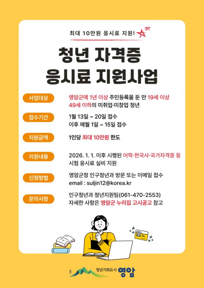 ÀÚ°ÝÁõ ÀÀ½Ã·á ½ÅûÀÏ ±âÁØ 1³â ÀÌ»ó ¿µ¾Ï±º¹ÎÀÎ ¹ÌÃë¾÷¡¤¹Ìâ¾÷ 19~49¼¼ û³âÀÌ ½ÅûÇÒ ¼ö ÀÖ°í, ¿ÃÇØ ½ÃÇàµÈ ½ÃÇè¿¡ ÀÀ½ÃÇÏ¸é ¿¹»êÀÇ ¹üÀ§ ³»¿¡¼­ ¼±Âø¼øÀ¸·Î Áö¿ø¹ÞÀ» ¼ö ÀÖ´Ù. ÀÌ´Þ ½Åû Á¢¼ö´Â 20ÀϱîÁöÀ̰í, 2¿ùºÎÅÍ´Â ¸Å¿ù 1~15ÀÏÀÌ Á¢¼ö±â°£ÀÌ´Ù.
