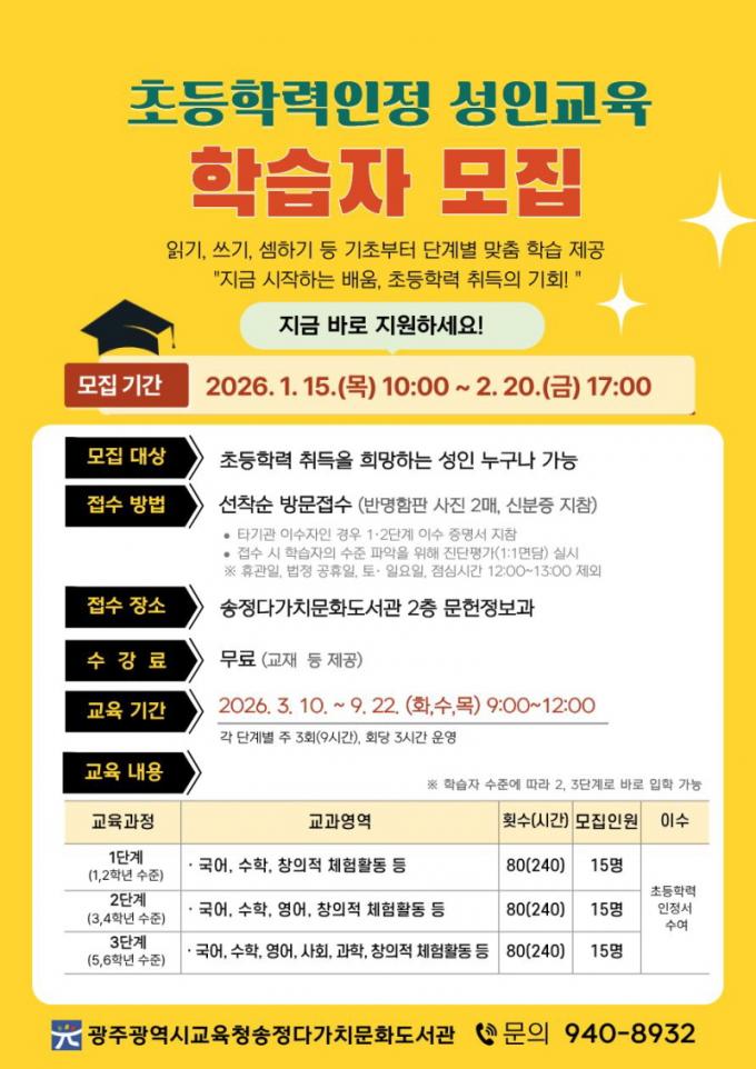[È£³²µµ¹Î½Å¹® = ÀÓÀ±Áø ±âÀÚ] ±¤Áֽñ³À°Ã»¼ÛÁ¤´Ù°¡Ä¡¹®È­µµ¼­°ü(ÀÌÇÏ ¼ÛÁ¤´Ù°¡Ä¡¹®È­µµ¼­°ü)Àº ¡®2026Çг⵵ ÃʵîÇзÂÀÎÁ¤ ¼ºÀα³À°¡¯ ÇÁ·Î±×·¥À» ¿î¿µÇÑ´Ù.