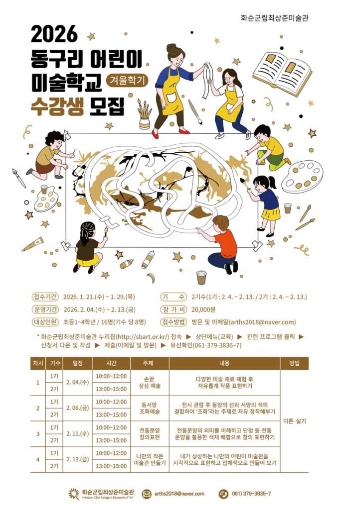 ¡®µ¿±¸¸® ¾î¸°ÀÌ ¹Ì¼úÇб³¡¯ °Ü¿ïÇбâ´Â 2¿ù 4ÀÏ(¼ö)ºÎÅÍ 2¿ù 13ÀÏ(±Ý)±îÁö ÁÖ 2ȸ(¼ö¡¤±Ý) ¿ÀÀü¹Ý°ú ¿ÀÈĹÝÀ¸·Î ³ª´©¾î ÁøÇàµÈ´Ù. ÃÑ 4Â÷½Ã °úÁ¤À¸·Î ±â¼öº° ¸ðÁý ÀοøÀº 8¸í ¼Ò±Ô¸ð·Î ¿î¿µµÅ º¸´Ù ÁýÁßÀûÀ̰í ü°èÀûÀÎ ¹Ì¼ú±³À°ÀÌ ÀÌ·ç¾îÁú ¿¹Á¤ÀÌ´Ù. ¼ö°·á´Â 2¸¸ ¿øÀÌ´Ù.