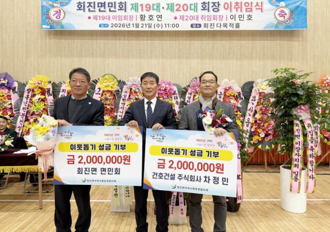 À̳¯ ±âŹ½Ä¿¡¼´Â ȸÁø¸é ¸é¹Îȸ(ȸÀå À̹ÎÈ£)°¡ 200¸¸ ¿ø, °ÇÈ£°Ç¼³ ÁÖ½Äȸ»ç(´ëÇ¥ Â÷Á¤¹Î)°¡ 200¸¸ ¿øÀ» °¢°¢ ±âŹÇϸç, Áö¿ªÀÇ ¾î·Á¿î ÀÌ¿ô°ú º¹Áö »ç°¢Áö´ë ÇØ¼Ò¸¦ À§ÇÑ µû¶æÇÑ ³ª´®¿¡ µ¿ÂüÇß´Ù.