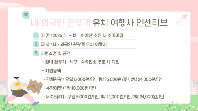 À̹ø Áö¿ø »ç¾÷Àº ±¤¾çÀ» ¹æ¹®ÇÏ´Â ´Üü °ü±¤°´À» ´ë»óÀ¸·Î °ü±¤Áö, ½Ä´ç, ¼÷¹Ú¾÷¼Ò µîÀ» ÀÌ¿ëÇÒ °æ¿ì ¿©Çà»ç¿¡ Àμ¾Æ¼ºê¸¦ Á¦°øÇÏ´Â ¹æ½ÄÀ¸·Î, ³»¡¤¿Ü±¹ÀÎ °ü±¤°´Àº ¹°·Ð ¼öÇп©Çà´Ü°ú MICE Çà»ç Âü°¡ÀÚ±îÁö Æø³Ð°Ô Áö¿øÇÑ´Ù.