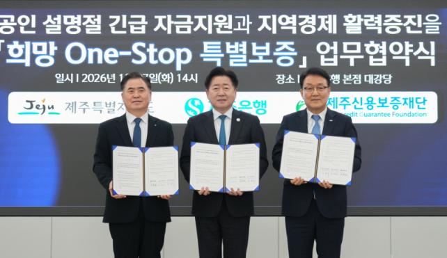 Á¦ÁÖµµ´Â 27ÀÏ Á¦ÁÖÀºÇà º»Á¡¿¡¼ Á¦ÁÖÀºÇà, Á¦Áֽſ뺸ÁõÀç´Ü°ú ÇÔ²² ¼Ò»ó°øÀÎ ¼³¸íÀý ±ä±Þ ÀÚ±ÝÁö¿ø°ú Áö¿ª°æÁ¦ Ȱ·Â ÁõÁøÀ» À§ÇÑ ¡®Èñ¸Á ¿ø½ºÅé(One-Stop) Ưº°º¸Áõ¡¯ ¾÷¹«Çù¾àÀ» ü°áÇß´Ù.