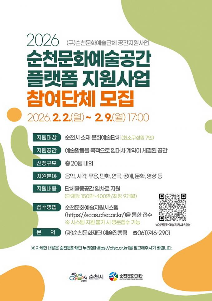 [È£³²µµ¹Î½Å¹® = ÀÓÀ±Áø ±âÀÚ] (Àç)¼øÃµ¹®È­Àç´ÜÀº ¿À´Â 2¿ù 2ÀϺÎÅÍ 9ÀϱîÁö Áö¿ª ¹®È­¿¹¼ú´ÜüÀÇ ¾ÈÁ¤ÀûÀΠȰµ¿ ±â¹ÝÀ» ¸¶·ÃÇϰí, ¹®È­¿¹¼ú °ø°£À» Áö¿ª ¹®È­¿¹¼ú »ýŰèÀÇ °ÅÁ¡À¸·Î À°¼ºÇϱâ À§ÇØ ¡®2026 ¼øÃµ¹®È­¿¹¼ú°ø°£ Ç÷§Æû Áö¿ø»ç¾÷¡¯¿¡ Âü¿©ÇÒ ¹®È­¿¹¼ú´Üü¸¦ ¸ðÁýÇÑ´Ù.
