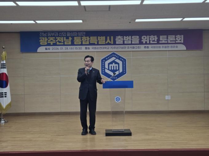 [È£³²µµ¹Î½Å¹® = ÀÓÀ±Áø ±âÀÚ] ´õºÒ¾î¹ÎÁÖ´ç ÁÖöÇö ±¹È¸ÀÇ¿ø(Àü³² ¿©¼ö½Ã°©)Àº 28ÀÏ, ±¹¸³¼øÃµ´ëÇб³¿¡¼­ ¡®Àü³²±¤ÁÖÆ¯º°½Ã¡¯ Ãâ¹ü °úÁ¤¿¡¼­ Àü³² µ¿ºÎ±Ç »ê¾÷ÀÇ ¿ªÇÒ°ú °æÀï·Â °­È­¸¦ ³íÀÇÇϱâ À§ÇÑ ¡¸±¤ÁÖÀü³² ÅëÇÕÆ¯º°½Ã Ãâ¹ü Åä·Ðȸ¡¹¸¦ °³ÃÖÇß´Ù.