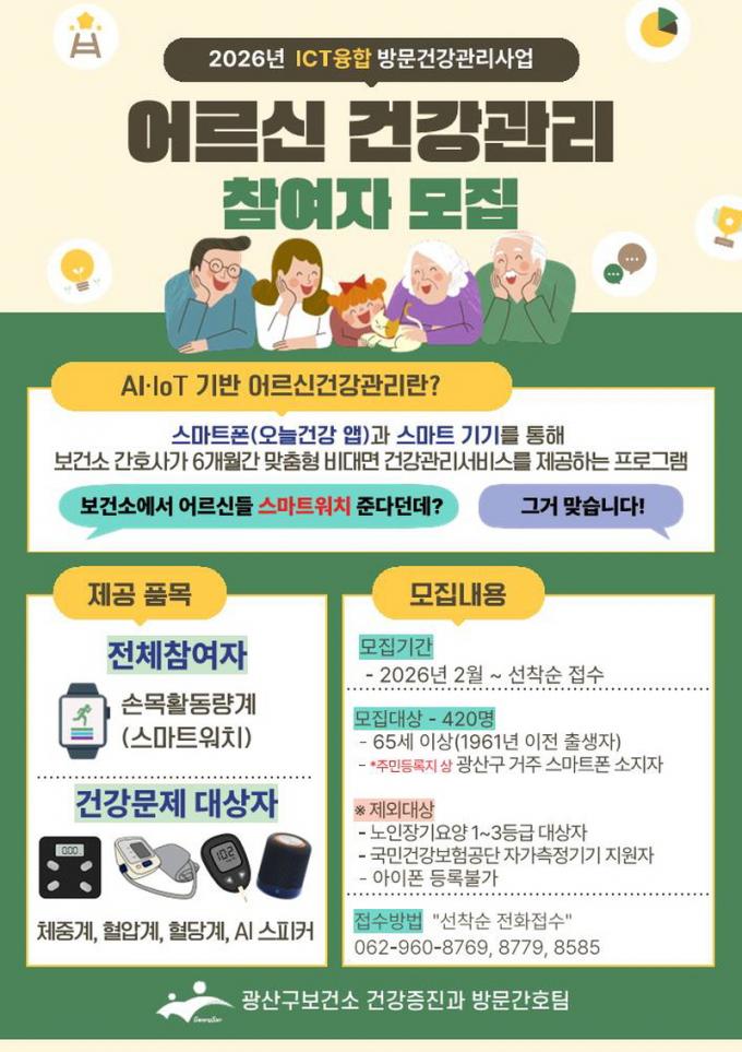 ¼±Á¤µÈ ´ë»óÀÚ´Â °Ç° ÃøÁ¤ °á°ú¿¡ µû¶ó °Ç°ÃøÁ¤±â±â(¡â¼Õ¸ñȰµ¿·®°è ¡âüÁß°è ¡âÇ÷¾Ð°è ¡âÇ÷´ç°è)¸¦ ¼±º°ÀûÀ¸·Î Áö±ÞÇÑ´Ù. ¸ðÁýÀº ¼±Âø¼øÀ¸·Î ÁøÇàµÇ¸ç 2¿ù 2ÀϺÎÅÍ 4¿ù 3ÀϱîÁö ±¤»ê±¸ º¸°Ç¼Ò °Ç°ÁõÁø°ú(062-960-8828, 8769)·Î ÀüÈ ½ÅûÇÏ¸é µÈ´Ù.