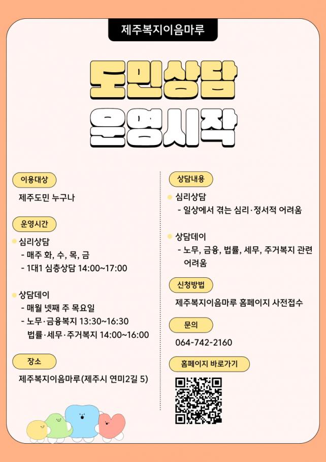 Á¦ÁÖº¹ÁöÀÌÀ½¸¶·çÀÇ »ó´ã »ç¾÷Àº µµ¹ÎÀÌ »ýȰ ¼Ó¿¡¼ °Þ´Â ´Ù¾çÇÑ ¹®Á¦¸¦ º¸´Ù ½±°Ô »ó´ã¹Þ°í ÇÊ¿äÇÑ Á¤º¸¸¦ Àû½Ã¿¡ Á¦°ø¹ÞÀ» ¼ö ÀÖµµ·Ï ¸¶·ÃµÇ¾ú´Ù. ƯÈ÷ 2026³âºÎÅÍ´Â ±âÁ¸ »ó´ã ºÐ¾ß¿¡ ´õÇØ ¡®±ÝÀ¶º¹Áö¡¯ ºÐ¾ß°¡ »õ·Ó°Ô Ãß°¡µÇ¾î °æÁ¦Àû ¾î·Á¿ò°ú À繫 °ü·Ã °í¹Î±îÁö º¸´Ù Æø³Ð°Ô Áö¿øÇÒ ¼ö ÀÖ´Â ±â¹ÝÀ» °ÈÇß´Ù.