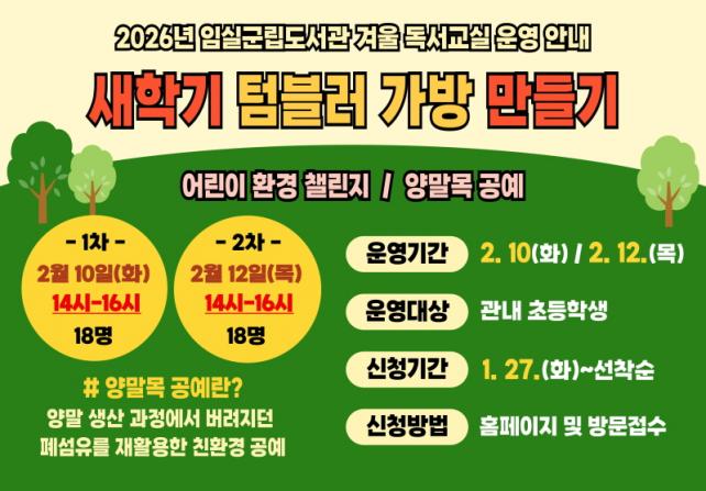 °Ü¿ï µ¶¼±³½ÇÀº 2026³â 2¿ù 10ÀϺÎÅÍ 12ÀϱîÁö ÀӽDZº¸³µµ¼°ü 1Ãþ ´Ù¸ñÀû½Ç¿¡¼ ÃÑ 2ȸ ÁøÇàµÇ¸ç, °ü³» ÃʵîÇлýÀ» ´ë»óÀ¸·Î ¿î¿µµÈ´Ù. Âü¿© ½ÅûÀº 1¿ù 27ÀϺÎÅÍ 2¿ù 6ÀϱîÁö ¿Â¶óÀÎ ¹× ¹æ¹® Á¢¼ö·Î ¼±Âø¼ø ¸ðÁýÇÑ´Ù.