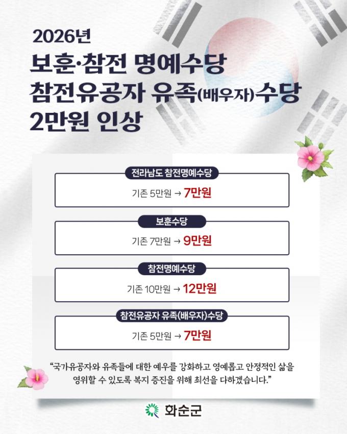 ÀÌ¿¡ µû¶ó º¸ÈƼö´çÀº ¿ù 7¸¸ ¿ø¿¡¼­ 9¸¸ ¿øÀ¸·Î, ÂüÀü¸í¿¹¼ö´çÀº ¿ù 10¸¸ ¿ø¿¡¼­ 12¸¸ ¿øÀ¸·Î ÀλóµÈ´Ù. ¶ÇÇÑ ÂüÀüÀ¯°øÀÚÀ¯Á·(¹è¿ìÀÚ)¼ö´ç°ú Àü¶ó³²µµ ÂüÀü¸í¿¹¼ö´ç ¿ª½Ã °¢°¢ ¿ù 5¸¸ ¿ø¿¡¼­ 7¸¸ ¿øÀ¸·Î »óÇâ Áö±ÞµÈ´Ù.