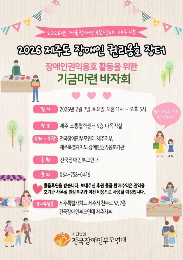 Àü±¹Àå¾ÖÀκθ𿬴ë Á¦ÁÖÁöºÎ°¡ ÁÖ°üÇÏ´Â À̹ø ÀåÅÍ´Â Àå¾ÖÀÎ ±ÇÀÍ¿ËÈ£ Ȱµ¿°ú ÇÔ²² Àå¾ÖÀαÇÀÍ¿ËÈ£±â°ü ÀÌÀü¿¡ ÇÊ¿äÇÑ ±â±ÝÀ» ¸¶·ÃÇϱâ À§ÇÑ ±â±Ý ¸¶·Ã ¹ÙÀÚȸ´Ù. Á¦ÁÖµµ Àå¾ÖÀαÇÀÍ¿ËÈ£±â°üÀº ÇöÀç Á¦Áֽà û±Ö·Î5±æ 21 1Ãþ¿¡¼­ Á¦Áֽà Áß¾Ó·Î 273, ³ª¶óŰ¿ò Á¦ÁÖ¸¶·ç·Î »ç¹«½Ç ÀÌÀüÀ» ÃßÁø ÁßÀÌ´Ù.