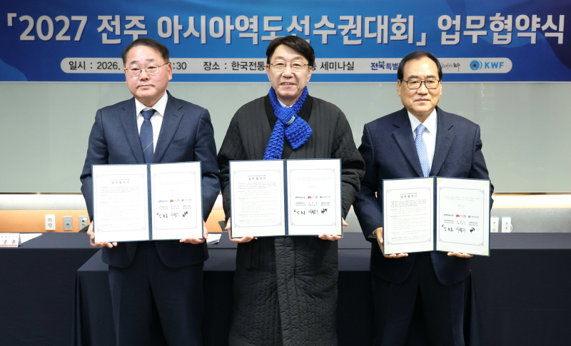 ÀüÁÖ½Ã¿Í ÀüºÏƯº°ÀÚÄ¡µµ, ´ëÇÑ¿ªµµ¿¬¸ÍÀº 9ÀÏ Çѱ¹ÀüÅë¹®ÈÀü´ç¿¡¼ ¿ì¹ü±â ÀüÁÖ½ÃÀå°ú ±èÁ¾ÈÆ ÀüºÏƯº°ÀÚÄ¡µµ °æÁ¦ºÎÁö»ç, ÃÖ¼º¿ë ´ëÇÑ¿ªµµ¿¬¸Í ȸÀå µîÀÌ Âü¼®ÇÑ °¡¿îµ¥ ¡®2027 ÀüÁÖ ¾Æ½Ã¾Æ¿ªµµ¼±¼ö±Ç´ëȸ ¼º°ø °³ÃÖ¸¦ À§ÇÑ ¾÷¹«Çù¾à¡¯À» ü°áÇß´Ù.