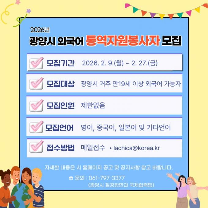 ¸ðÁý ´ë»óÀº °ø°íÀÏ ±âÁØ ±¤¾ç½Ã¿¡ °ÅÁÖÇÏ´Â ¸¸ 19¼¼ ÀÌ»ó ½Ã¹ÎÀ¸·Î, ¿µ¾î¡¤Áß±¹¾î¡¤ÀϺ»¾î¸¦ ºñ·ÔÇÑ ±âŸ ¿Ü±¹¾î ±¸»ç°¡ °¡´ÉÇÏ¸é ´©±¸³ª ½ÅûÇÒ ¼ö ÀÖ´Ù. ¼±¹ßµÈ Å뿪ÀÚ¿øºÀ»çÀÚ´Â ¸ÅÈÃàÁ¦ µî ±¤¾ç½Ã ÁÖ¿ä ÃàÁ¦¿Í °¢Á¾ ´ëÇü Çà»ç¿¡¼ ¿Ü±¹ÀÎ ´ë»ó ÇöÀå ¾È³» ¹× Å뿪À» Áö¿øÇÏ°Ô µÇ¸ç, °ü³» ±â°ü¡¤¾÷ü ÇùÁ¶ ¿äû¿¡ µû¸¥ Å뿪 Áö¿ø, ¿Ü±¹ÀÎ °ü±¤°´ ¹× ±¤¾ç½Ã °ÅÁÖ ¿Ü±¹ÀÎÀ» ´ë»óÀ¸·Î ÇÑ ¾È³»¡¤¹Î¿ø ÇùÁ¶ µî ´Ù¾çÇÑ È°µ¿À» ¼öÇàÇÏ°Ô µÈ´Ù.