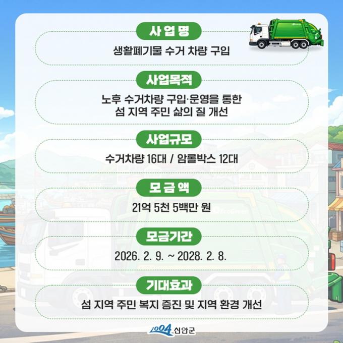 [È£³²µµ¹Î½Å¹® = ÀÓÀ±Áø ±âÀÚ] ½Å¾È±ºÀº µµ¼­Áö¿ª ÁÖ¹ÎÀÇ »ýȰ ºÒÆíÀ» ÇØ¼ÒÇϰí ÄèÀûÇÑ È¯°æÀ» Á¶¼ºÇϱâ À§ÇØ, 2026³â 2¿ù 9ÀϺÎÅÍ ³ëÈÄ »ýȰÆó±â¹° ¼ö°Å Â÷·® ±³Ã¼ Àç¿ø ¸¶·ÃÀ» À§ÇÑ °íÇâ»ç¶û ÁöÁ¤±âºÎ»ç¾÷(½Å¾È±º Á¦3È£) ¸ð±ÝÀ» ÃßÁøÇÑ´Ù°í ¹àÇû´Ù.