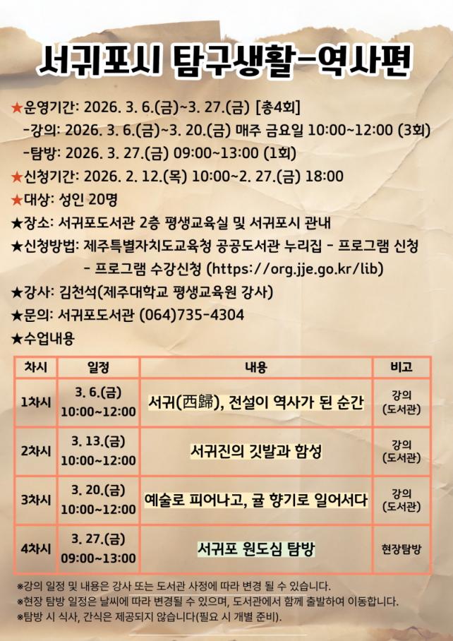 ³»´Þ 6ÀÏ¡¤13ÀÏ¡¤20ÀÏ °­ÀÇ´Â ¿ÀÀü 10½ÃºÎÅÍ 12½Ã±îÁö ¼­±ÍÆ÷µµ¼­°ü 2Ãþ Æò»ý±³À°½Ç¿¡¼­ ÁøÇàµÇ¸ç 4Â÷½Ã ÇöÀå Ž¹æÀº ³»´Þ 27ÀÏ ¿ÀÀü 9½ÃºÎÅÍ ¿ÀÈÄ 1½Ã±îÁö ¼­±ÍÆ÷½Ã ¿øµµ½É ÀÏ¿ø¿¡¼­ ¿î¿µµÈ´Ù.