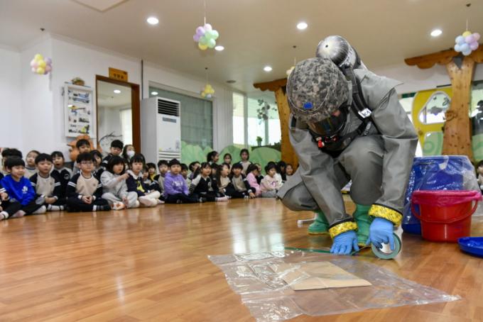 ÇöÀå Á¶Ä¡ ÈÄ¿¡´Â À¯Ä¡¿ø»ý ´ë»ó È»ý¹æ Àåºñ ¼Ò°³ ¹× ½Ã¿¬ÀÌ À̾îÁ³´Ù. ¿ä¿øµéÀº ¾ÆÀ̵éÀÇ ´«³ôÀÌ¿¡ ¸ÂÃç ¹æµ¶¸é, º¸È£ÀÇ µî ÀåºñÀÇ ¿ªÇÒÀ» ½±°Ô ¼³¸íÇϸç È»ý¹æ ÈÆ·ÃÀÌ »ý¸íÀ» º¸È£ÇÏ´Â Áß¿äÇÑ È°µ¿ÀÓÀ» °Á¶Çß´Ù. ƯÈ÷ Èñ¸Á ¾Æµ¿À» ´ë»óÀ¸·Î ¹æµ¶¸é¡¤º¸È£ÀÇ Âø¿ë üÇèÀ» ÁøÇàÇØ, ÈÆ·ÃÀ» º¸´Ù Ä£¼÷ÇÏ°Ô ´À³¥ ¼ö ÀÖµµ·Ï Çß´Ù.