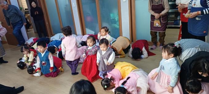 À̳¯ ¾î¸°À̵éÀº ÁغñÇÑ À²µ¿°ú ³ë·¡¸¦ ¼±º¸ÀÌ¸ç ¾î¸£½Åµé¿¡°Ô ¿ôÀ½À» ÀüÇß°í, »õÇØ Àλ縦 ´ã¾Æ Å«ÀýÀ» ¿Ã·È´Ù. ¾î¸£½ÅµéÀº ¾ÆÀ̵éÀÇ ¹æ¹®¿¡ °¨»çÀÇ ¶æÀ» ÀüÇÏ¸ç ´ö´ãÀ» °Ç³Þ´Ù.