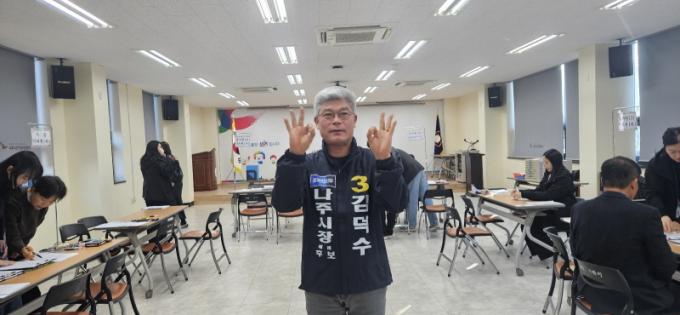 ±è ¿¹ºñÈ帴 Èĺ¸ µî·Ï Á÷ÈÄ ¡°Á¶±¹Çõ½Å´ç ³ªÁÖ½ÃÀå ¿¹ºñÈĺ¸ ±âÈ£ 3¹ø ±è´ö¼ö! ±âÈ£¿Í À̸§ÀÌ ÀûÈù ¼±°Å¿îµ¿º¹À» ÀÔÀÚ¸¶ÀÚ ±è´ëÁß ´ëÅë·É´ÔÀÇ ÆòȹÎÁÖ´çÀÌ ¶°¿Ã¶ú´Ù.¡±¸ç ¡°1987³â ±âÈ£ 3¹øÀ» ´Þ°í ±º»çÁ¤±Ç Á¾½Ä, Á¤±Ç±³Ã¼¿Í ¹ÎÁÖȸº¹À» ¿ÜÄ¡´ø ±â¾ïÀÌ »ý»ýÇÏ´Ù.¡±°í ¹÷Âù ¼Òȸ¸¦ ¹àÇû´Ù. ÀÌ¾î ¡°¿À´Â 6¿ù 3ÀÏ Á¶±¹Çõ½Å´çÀÇ À̸§À¸·Î Áö¹æÀÚÄ¡ Çõ½Å°ú ¼¼´ë±³Ã¼¸¦ ÀÌ·èÇÏ°í ½Ã¹ÎÀÌ ÁøÁ¤ÇÑ ÁÖÀÎÀÌ µÇ´Â ³ªÁÖ¸¦ ¸¸µé°Ú´Ù.¡±¸ç Ã⸶ °¢¿À¸¦ ¹àÇû´Ù.