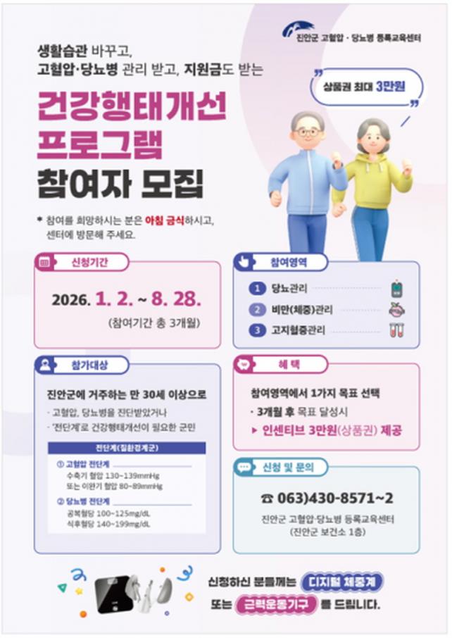 ¼¾ÅÍ °ü°èÀÚ´Â ¡°°íÇ÷¾Ð°ú ´ç´¢º´Àº ²ÙÁØÇÑ °ü¸®°¡ ¹«¾ùº¸´Ùµµ Áß¿äÇÏ´Ù¡±¸ç À̹ø ÇÁ·Î±×·¥ÀÌ ÁֹεéÀÇ Ç÷¾Ð¡¤Ç÷´ç Á¶Àý·ü Çâ»ó°ú ÇÕº´Áõ ¿¹¹æ¿¡ µµ¿òÀÌ µÇ±æ ±â´ëÇÑ´Ù¸ç, ÀÚ¼¼ÇÑ »çÇ×Àº Áø¾È±º °íÇ÷¾Ð¡¤´ç´¢º´ µî·Ï±³À°¼¾ÅÍ (063-430-8571~2)·Î ¹®ÀÇÇÏ¸é µÈ´Ù.