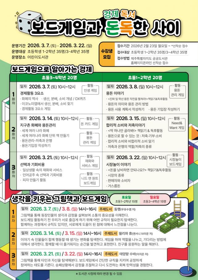 À̹ø ÇÁ·Î±×·¥Àº 3¿ù 7ÀÏ(Åä)ºÎÅÍ 22ÀÏ(ÀÏ)±îÁö ¾î¸°À̵µ¼°ü¿¡¼ ¡ãº¸µå°ÔÀÓÀ¸·Î ¾Ë¾Æ°¡´Â °æÁ¦ ¡ã»ý°¢À» Ű¿ì´Â ±×¸²Ã¥°ú º¸µå°ÔÀÓ µî 2°³ °úÁ¤À¸·Î ÁøÇàµÈ´Ù.