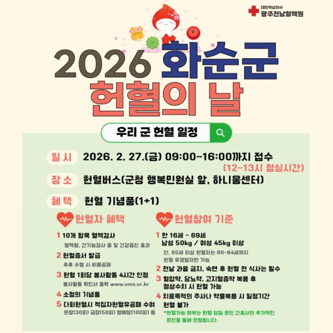 µ¿Àý±â´Â Ãß¿î ³¯¾¾¿Í ¹æÇÐ, ¿¬¸»¿¬½Ã µîÀ¸·Î ÇåÇ÷ Âü¿©À²ÀÌ ³·¾ÆÁ® Ç÷¾× º¸À¯·®ÀÌ °¨¼ÒÇÏ´Â ½Ã±â´Ù. ÀÌ¿¡ È­¼ø±ºÀº ±¤ÁÖ¡¤Àü³² Ç÷¾×¿ø°ú Çù·ÂÇØ Ç÷¾× ¼ö±Þ ¾ÈÁ¤È­¸¦ À§ÇÑ ´ëÀÀÃ¥À¸·Î À̹ø ÇåÇ÷ Çà»ç¸¦ ¸¶·ÃÇß´Ù.