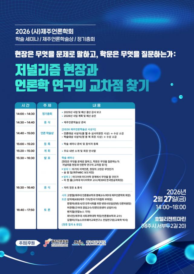 [È£³²µµ¹Î½Å¹® = ÀÓÀ±Áø ±âÀÚ] (»ç)Á¦ÁÖ¾ð·ÐÇÐȸ(ȸÀå Á¤¿ëº¹)Àº ¡®ÇöÀåÀº ¹«¾ùÀ» ¹®Á¦·Î ¸»Çϰí, Çй®Àº ¹«¾ùÀ» Áú¹®Çϴ°¡: Àú³Î¸®Áò ÇöÀå°ú ¾ð·ÐÇÐ ¿¬±¸ÀÇ ±³Â÷Á¡ ã±â¡¯ ÁÖÁ¦ÀÇ 2026³â ù Çмú¼¼¹Ì³ª¸¦ 2¿ù 27ÀÏ(±Ý) ¿ÀÈÄ 3½Ã È£ÅÚ¸®Á¨Æ®¸¶¸°¿¡¼­ °³ÃÖÇÑ´Ù.