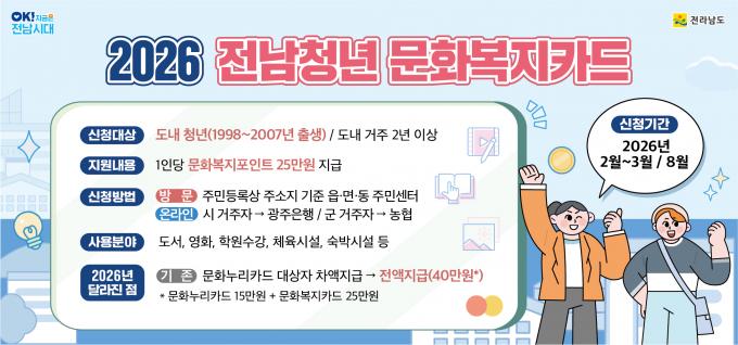 [È£³²µµ¹Î½Å¹® = ÀÓÀ±Áø ±âÀÚ] Àü¶ó³²µµ°¡ Áö¿ª û³âÀÇ ¹®È­ ÇâÀ¯¿Í ÀÚ±â°è¹ß ±âȸ¸¦ ³ÐÈ÷±â À§ÇØ 19~28¼¼ û³â¿¡°Ô ¿¬ 25¸¸ ¿øÀ» Áö¿øÇÏ´Â ¡®Àü³² û³â ¹®È­º¹ÁöÄ«µå¡¯ ½ÅûÀ» 3¿ù ¸»±îÁö Á¢¼öÇÑ´Ù.