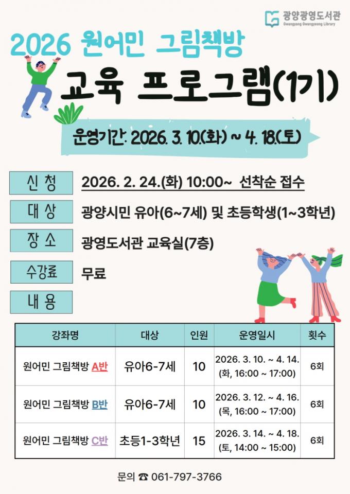 À̹ø ÇÁ·Î±×·¥Àº ¿ø¾î¹Î °»ç°¡ ¿µ¾î ±×¸²Ã¥À» Á÷Á¢ ÀоîÁÖ°í ´Ù¾çÇÑ µ¶ÈÄ È°µ¿À» º´ÇàÇÏ´Â ¿µ¾î Æ¯È ÇÁ·Î±×·¥À¸·Î, ¾î¸°À̵éÀÌ ¿µ¾î¸¦ ÀÚ¿¬½º·´°Ô Á¢Çϸç Èï¹Ì¸¦ ³ôÀÌ°í µ¶¼¸¦ »ýȰÈÇÒ ¼ö ÀÖµµ·Ï ¸¶·ÃµÆ´Ù. ¿î¿µ °Á´ ¡ã¿ø¾î¹Î ±×¸²Ã¥¹æ A¹Ý ¡ãB¹Ý(À¯¾Æ 6~7¼¼) ¡ãC¹Ý(Ãʵî 1~3Çгâ) ÃÑ 3°³ ¹ÝÀ¸·Î ±¸¼ºµÇ¸ç, °¢ ¹ÝÀº ±â¼öº° 6ȸ¾¿ 3±â·Î ¿î¿µµÅ ÃÑ 54ȸ¿¡ °ÉÃÄ ÁøÇàµÈ´Ù. ¸ðÁý ÀοøÀº ±â¼öº° 35¸íÀ¸·Î, À¯¾Æ 20¸í°ú Ãʵî 15¸íÀ» ¼±¹ßÇÑ´Ù. À¯¾Æ¹Ý(A¡¤B¹Ý)Àº º¸´Ù ¸¹Àº ¾î¸°À̵鿡°Ô Âü¿© ±âȸ¸¦ Á¦°øÇϱâ À§ÇØ Áߺ¹ ½ÅûÀ» Á¦ÇÑÇϵÇ, Á¤¿ø ¹Ì´Þ ½Ã¿¡´Â Áߺ¹ Âü¿©¸¦ Çã¿ëÇÒ ¹æÄ§ÀÌ´Ù.