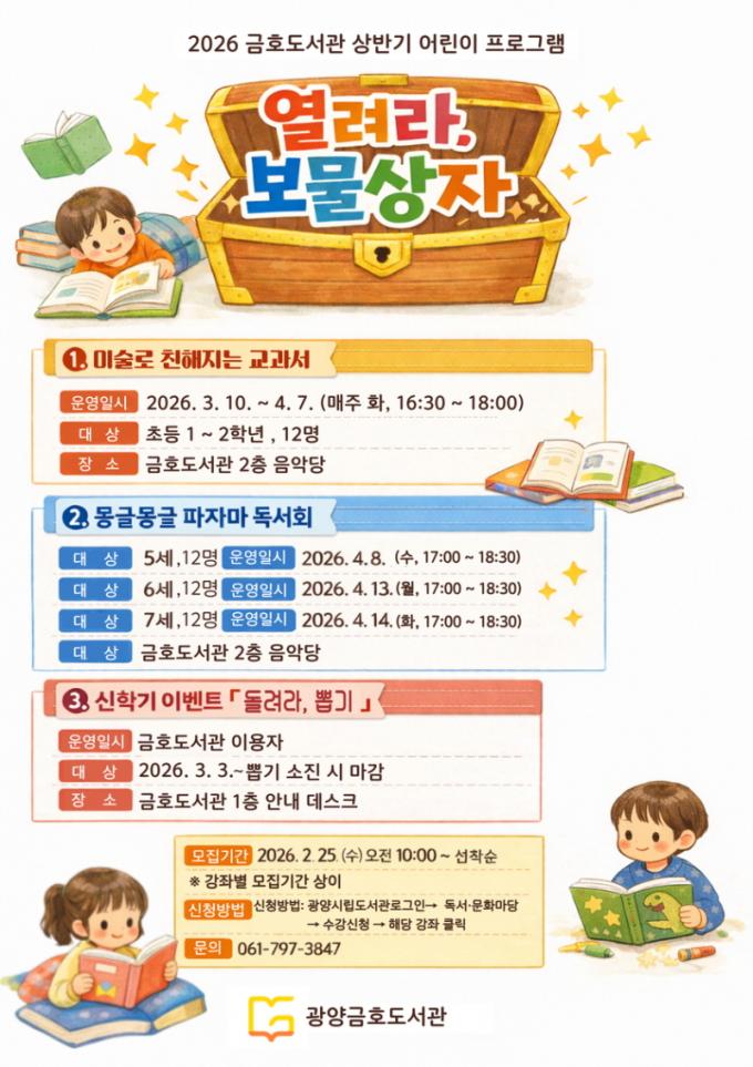 ÇÑÆí, 2026³â ±ÝÈ£µµ¼°ü »ó¹Ý±â ¾î¸°ÀÌ ÇÁ·Î±×·¥°ú °ü·ÃÇÑ ÀÚ¼¼ÇÑ »çÇ×Àº ±¤¾ç½Ã¸³µµ¼°ü ´©¸®Áý(https://lib.gwangyang.go.kr)¿¡¼ È®ÀÎÇϰųª ±ÝÈ£µµ¼°ü(¢Ï061-797-3847)À¸·Î ¹®ÀÇÇÏ¸é ¾È³»¹ÞÀ» ¼ö ÀÖ´Ù.