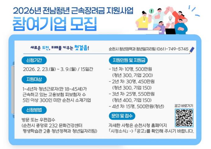 [È£³²µµ¹Î½Å¹® = ÀÓÀ±Áø ±âÀÚ] ¼øÃµ½Ã´Â Áö¿ª û³âµéÀÇ Á¤±ÔÁ÷ Ãë¾÷ ÃËÁø ¹× Àå±â±Ù¼ÓÀ» À¯µµÇϱâ À§ÇØ 2026³â Àü³² û³â ±Ù¼ÓÀå·Á±Ý Áö¿ø»ç¾÷ Âü¿© ±â¾÷À» ¸ðÁýÇÑ´Ù°í ¹àÇû´Ù.