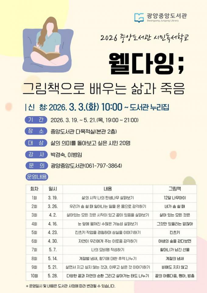 ½Ã¹Îµ¶¼­Çб³´Â ±¤¾ç½Ã¹ÎÀÇ Ã¥ Àд ¹®È­ Á¤Âø°ú Àι®ÇÐÀû ¼Ò¾ç ÇÔ¾çÀ» À§ÇØ ¸¶·ÃµÈ ÇÁ·Î±×·¥À¸·Î, ¿ÃÇØ »ó¹Ý±â¿¡´Â ¡ãÀι®Çа­µ¶-È­¿äöÇÐȸ(20¸í) ¡ãÀ£´ÙÀ×; ±×¸²Ã¥À¸·Î ¹è¿ì´Â »î°ú Á×À½(20¸í) ¡ã½Ã´Ï¾î Å«±ÛÀÚÃ¥ ±Û¾²±â(15¸í) µî ÃÑ 3°³ °­Á¸¦ ¿î¿µÇÑ´Ù.