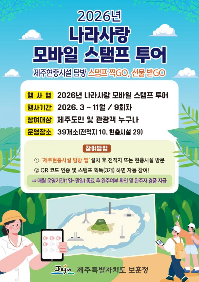 Âü¿© ¹æ¹ýÀº ¸ð¹ÙÀÏ Ç÷¹À̽ºÅä¾î[¾Û½ºÅä¾î]¿¡¼ ¡®Á¦ÁÖ ÇöÃæ½Ã¼³ Ž¹æ¡¯ ¾ÛÀ» ¼³Ä¡ÇÑ µÚ Çà»ç ±â°£ Áß µµ³» ÇöÃæ½Ã¼³°ú ÀüÀûÁö¸¦ ¹æ¹®ÇØ ÀÎÁõÇÏ°í ½ºÅÆÇÁ¸¦ ȹµæÇϸé ÀÚµ¿À¸·Î Âü¿©µÈ´Ù.