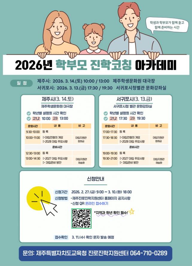 Çкθð ÁøÇÐÄÚĪ ¾ÆÄ«µ¥¹Ì´Â ´ëÀÔÀ» ÁغñÇÏ´Â ¼öÇè»ý°ú º¸È£ÀÚ¸¦ ´ë»óÀ¸·Î ¸Å³â ¿î¿µµÇ´Â ´ëÇÐ ÁøÇÐ Á¤º¸ Á¦°ø ÇÁ·Î±×·¥À¸·Î µµ±³À°Ã» Á¦ÁÖÁø·ÎÁøÇÐÁö¿ø¼¾ÅͰ¡ ÁÖ°üÇÏ¸ç ¿ÃÇØ´Â Áö¿ªº° Âü¿© ±âȸ¸¦ È®´ëÇϱâ À§ÇØ Á¦ÁÖ½Ã¿Í ¼±ÍÆ÷½Ã¿¡¼ °¢°¢ °³ÃÖÇϰí Çг⺰ Ư¼º¿¡ ¸ÂÃç ´ë»óÀ» ±¸ºÐÇØ ¿î¿µÇÑ´Ù.